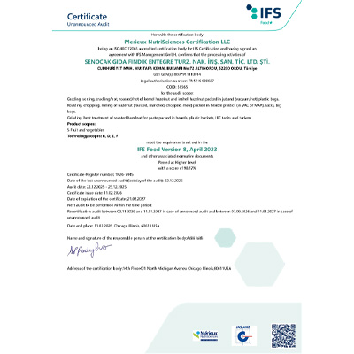 The company holds various certifications including ISO 22000, BRC, UTZ/RAINFOREST ALLIANCE, IFS, Kosher and Halal certificates as well as the Ecocert Organic certification for the organic product line. The company is also a member of the Sedex and INC. The factory has the capacity to produce 15000 tons of raw hazelnuts per year and 10000 tons of roasted, blanched, diced, meal and paste hazelnuts (combined) per year. The company continuously monitors and adjusts capacity to meet demand.